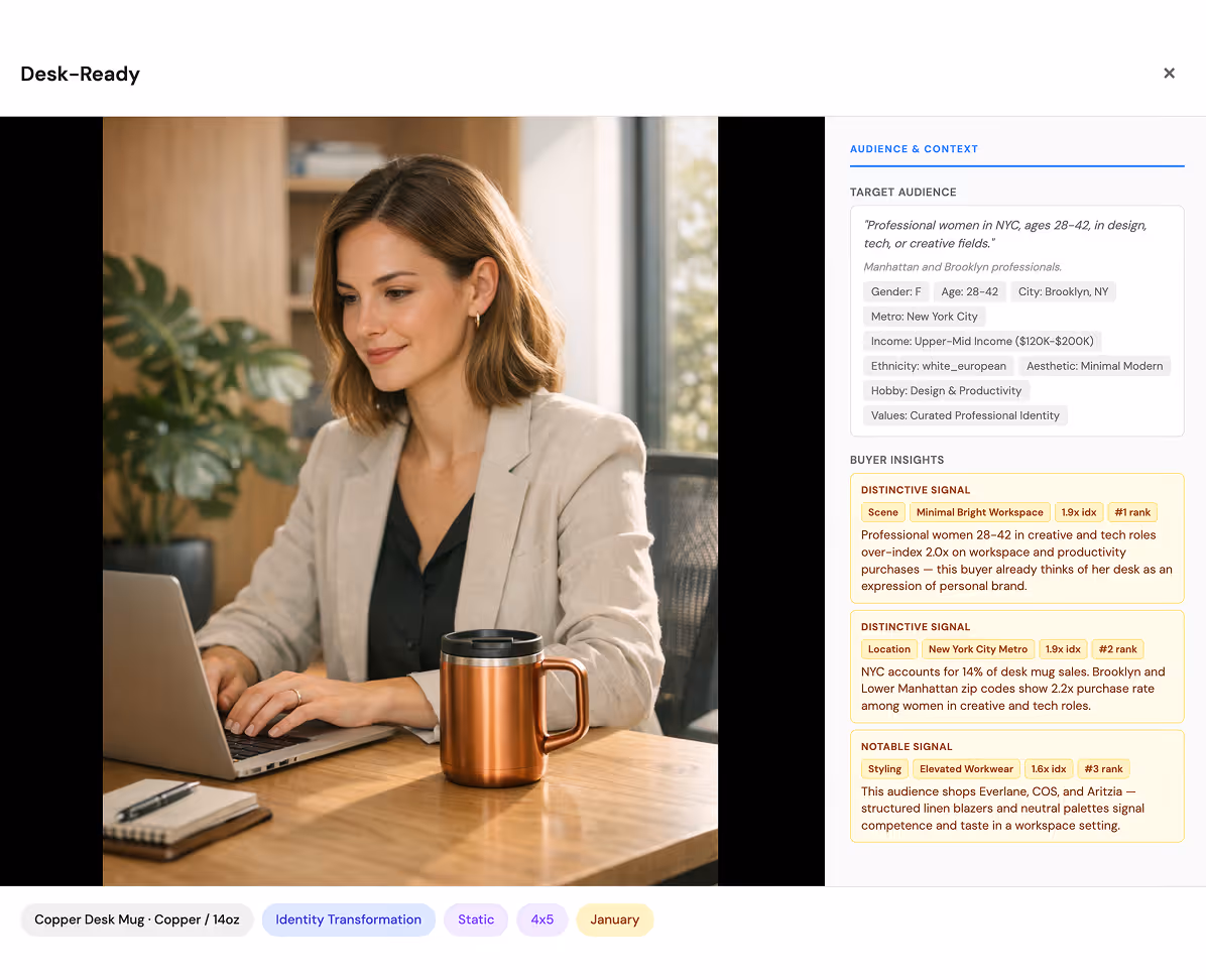 It analyzes how real shoppers respond to different products, aesthetics, messages, and contexts across the broader market, and then turns that conversion intelligence into clear creative direction: