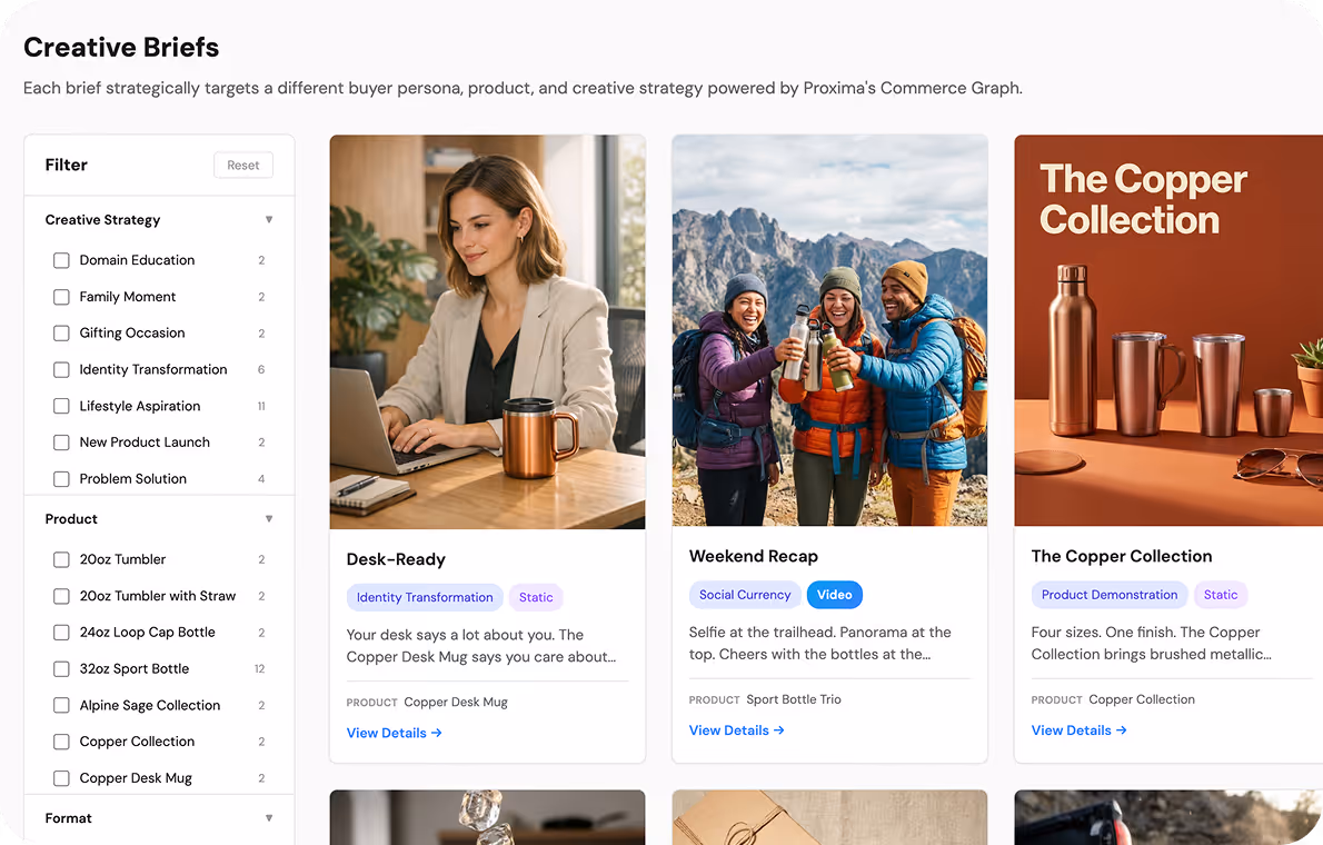 Creative Briefs sit inside Proxima’s Creative Engine Layer. They bridge the gap between what the data is telling you and what your team actually makes next So instead of guessing, you execute with confidence.